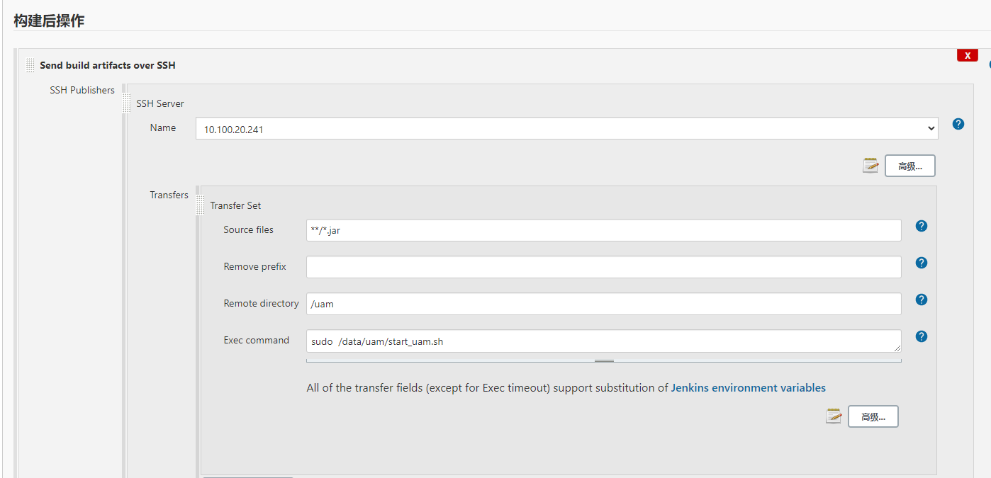 5、最后在构建流水线的时候,选择“构建后操作”,就可以远程发布执行命令了