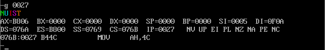 使用debug工具对程序进行调试,使用g命令一次性执行到程序返回前(即ine25执行之后、line27执行之前)的截图