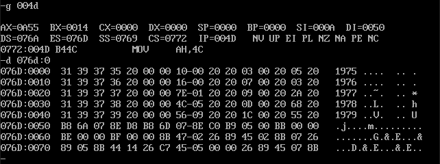 在debug中运行到程序退出之前,使用d命令查看table段对应的内存空间的截图,确认信息是否按要求结构化地写入到指定内存