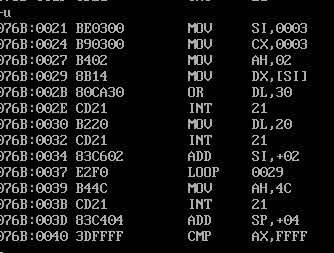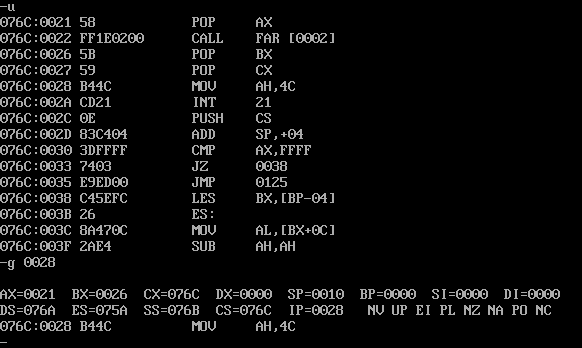 Q1 根据call指令的跳转原理,先从理论上分析,程序执行到退出(line31)之前,寄存器(ax) = 0021 寄存器(bx) = 0026 寄存器(cx) = 076C