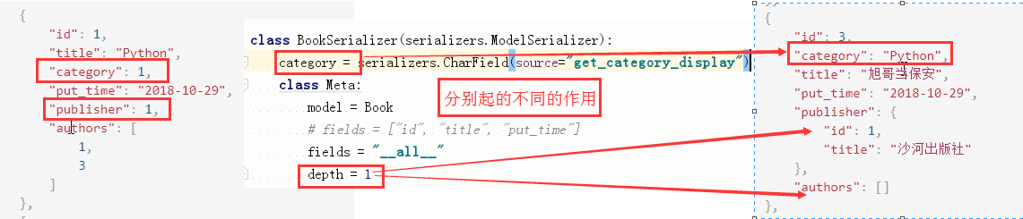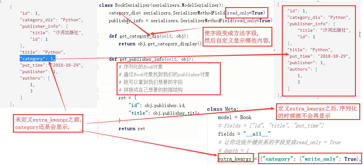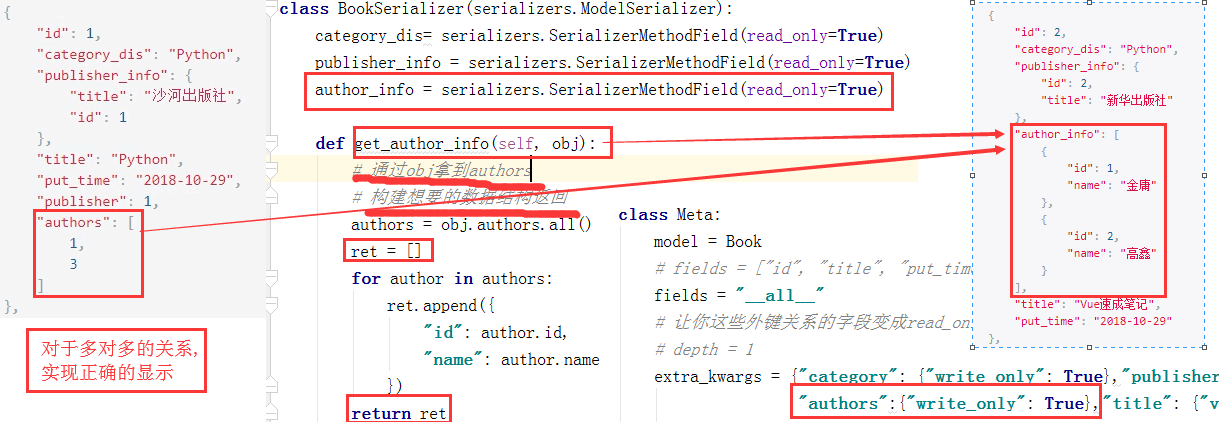 class BookSerializer(serializers.ModelSerializer): category_dis= serializers.SerializerMethodField(read_only=True) publisher_info = serializers.SerializerMethodField(read_only=True) author_info = serializers.SerializerMethodField(read_only=True) def get_author_info(self, obj): # 通过obj拿到authors # 构建想要的数据结构返回 authors = obj.authors.all() ret = [] for author in authors: ret.append({ "id": author.id, "name": author.name }) return ret
