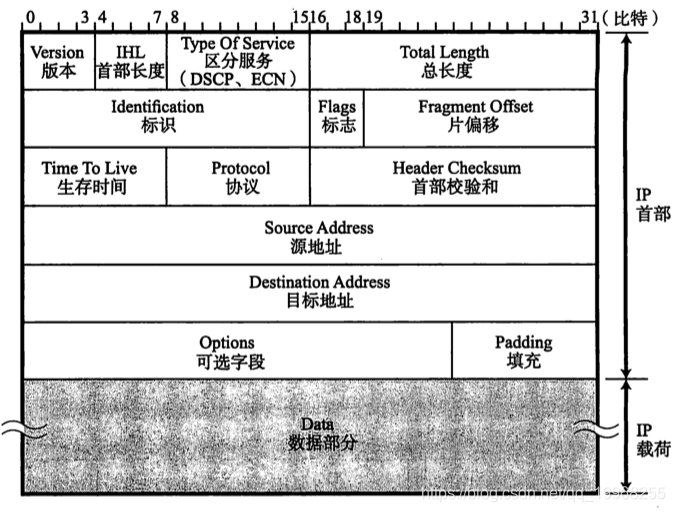 填充:填充物。在有可选项的情况下,首部长度可能不是32比特的整数倍。通过向字段填充0,调整为32比特的整数倍。