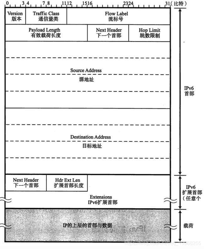 有效载荷长度:包的数据部分。IPv4的TL(Total Length)指包括首部在内所有长度。然而IPv6中的这个不包括首部,只表示数据部分的长度。