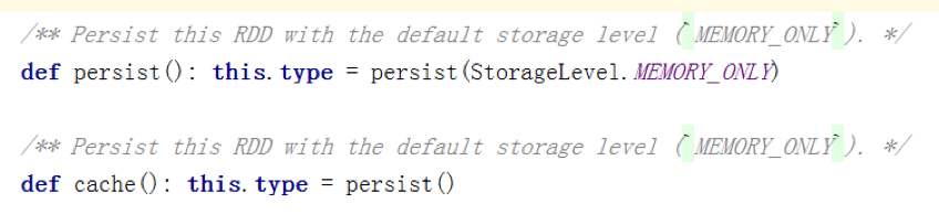 通过查看源码发现cache最终也是调用了persist方法,默认的存储级别都是仅在内存存储一份,Spark的存储级别还有好多种,存储级别在object StorageLevel中定义的。