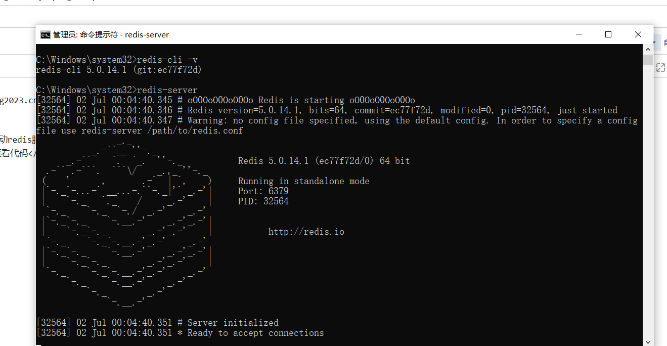 出现如图所示的redis 初始化成功,准备好连接,就是启动成功了,启动成功后不能关闭改cmd窗口,如果关了,则redis服务就关掉了。