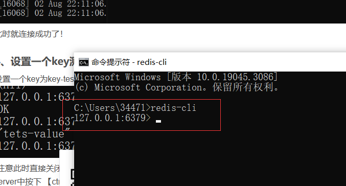 在上述redis服务启动成功且没有关闭的情况下,启动一个新的cmd窗口。