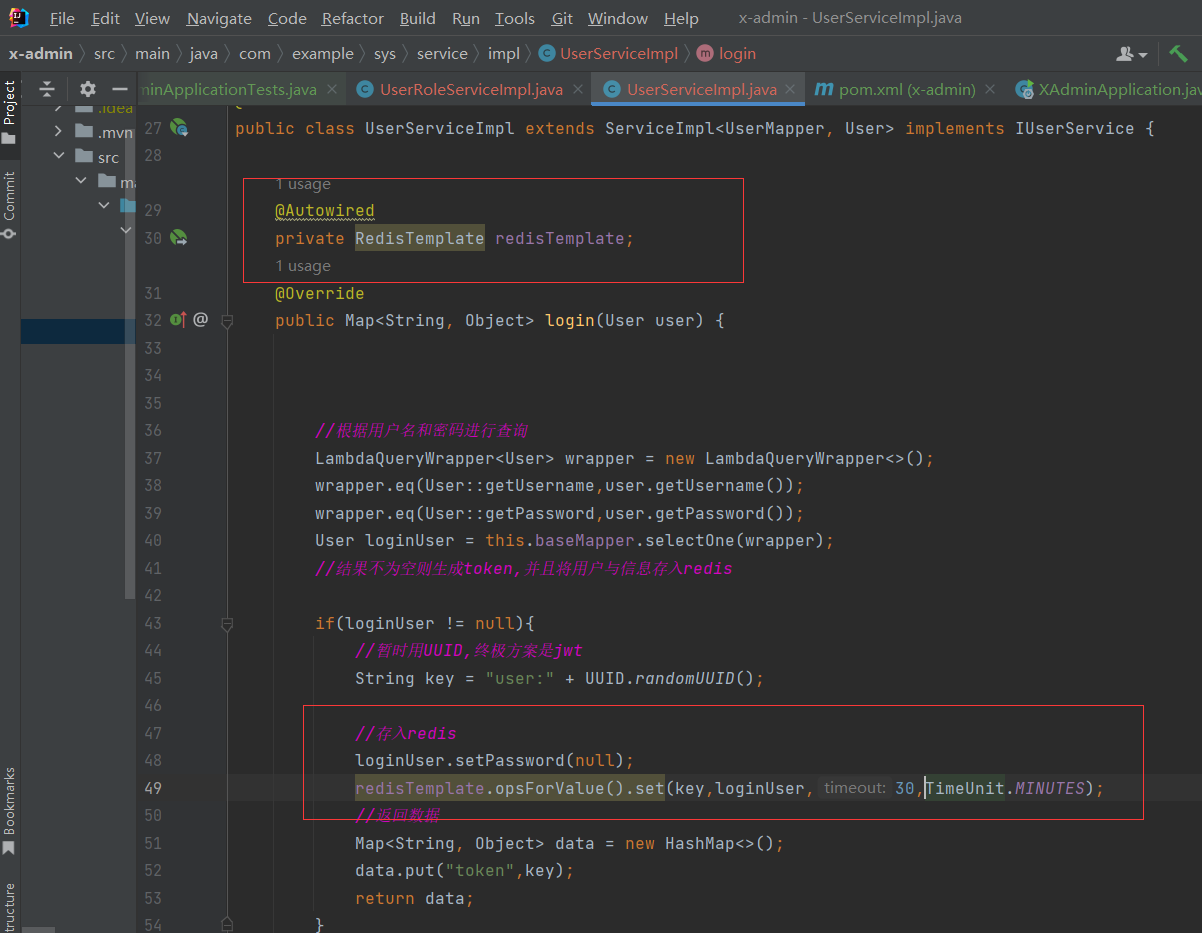 说明:1.结果不为空则生成token(登录凭证),在前后端分离项目中,session是无效的,所以用token,所以这里生成token并且将用户信息存入redis。