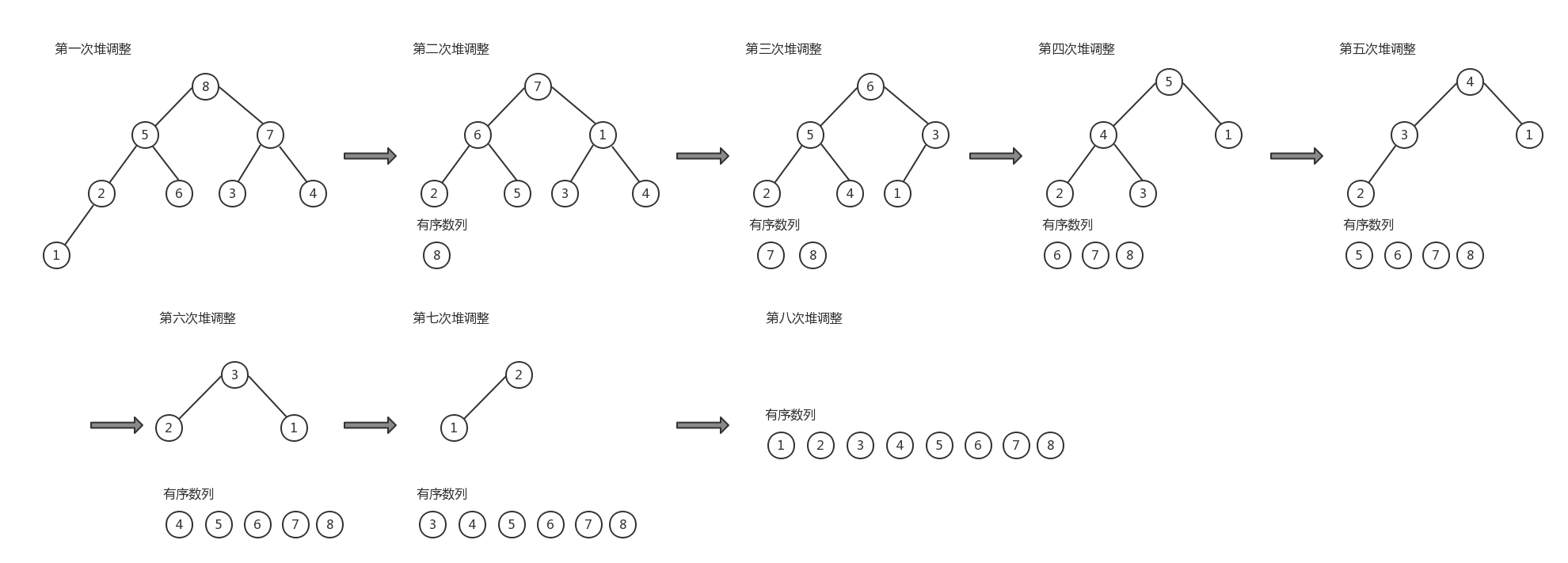 假定待排序的数列为:{5,8,5,7,8,1,4,5,8,7,6,3,4,1},则堆排序过程如下所示: