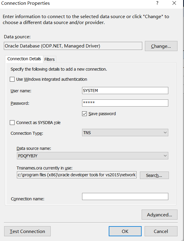 oracle 数据库 使用 TNS 提供服务。问题 : 郫都区 HDATACENTER 开发时 安装的 ODTC For Visual Studio 2015 安装好后, 创建ORACLE连接时 使用 Oracle Database (ODP.NET, Managed Driver)