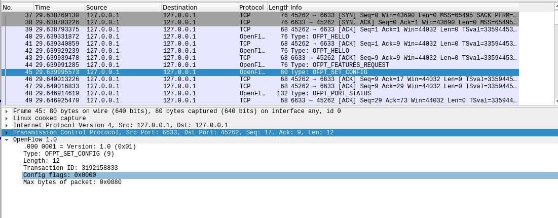 控制器6633端口 (hello报文)<---> 交换机45262端口(hello报文),双方建立连接,并使用OpenFlow 1.0