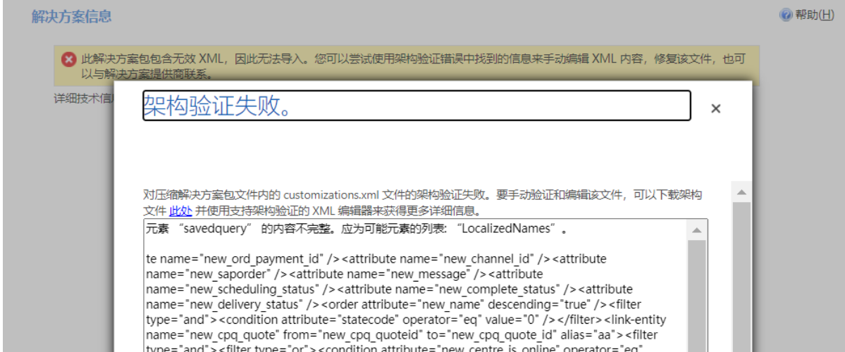 “压缩解决方案包文件中customizations.xml文件的架构验证失败。 若要手动验证和编辑文件,可以 在此 处下载架构文件,并使用支持架构验证的 XML 编辑器获取更多详细信息。