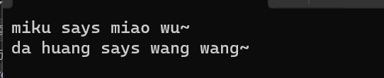1 #include<iostream> 2 #include<string> 3 using namespace std; 4 class MachinePets 5 { 6 private: 7 string nickname; 8 public: 9 MachinePets(const string s) :nickname{ s } {} 10 string get_nickname() const { return nickname; } 11 virtual string talk() = 0; 12 }; 13 class PetCats :public MachinePets 14 { 15 public: 16 PetCats(const string s) :MachinePets{ s } {} 17 string talk() 18 { 19 return "miao wu~"; 20 } 21 22 23 }; 24 class PetDogs:public MachinePets 25 { 26 public: 27 PetDogs(const string s) :MachinePets{ s } {} 28 string talk() 29 { 30 return "wang wang~"; 31 } 32 33 };