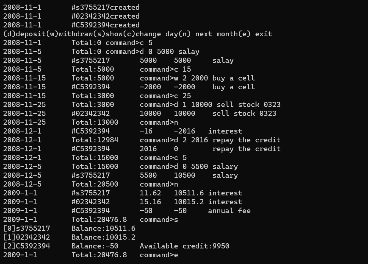 1 #include"account.h" 2 #include<iostream> 3 using namespace std; 4 int main() 5 { 6 Date date(2008, 11, 1); 7 SavingsAccount sa1(date, "s3755217", 0.015); 8 SavingsAccount sa2(date, "02342342", 0.015); 9 CreditAccount ca(date, "C5392394", 10000, 0.0005, 50); 10 Account* accounts[] = { &sa1,&sa2,&ca }; 11 const int n = sizeof(accounts) / sizeof(Account*); 12 cout << "(d)deposit(w)withdraw(s)show(c)change day(n) next month(e) exit" << endl; 13 char cmd; 14 do { 15 date.show(); 16 cout << "\tTotal:" << Account::getToal() << "\tcommand"; 17 int index, day; 18 double amount; string desc; 19 cin >> cmd; 20 switch (cmd) 21 { 22 case'd': 23 cin >> index >> amount; 24 getline(cin, desc); 25 accounts[index]->deposit(date, amount, desc); 26 break; 27 case'w': 28 cin >> index >> amount; 29 getline(cin, desc); 30 accounts[index]->withdraw(date, amount, desc); 31 break; 32 case's': 33 for (int i = 0; i < n; i++) 34 { 35 cout << "[" << i << "]"; 36 accounts[i]->show(); 37 cout << endl; 38 } 39 break; 40 case'c': 41 cin >> day; 42 if (day << date.getDay()) 43 cout << "You cannot specify a previous day"; 44 else if (day > date.getMaxDay()) 45 cout << "Invalid day"; 46 else 47 date = Date(date.getYear(), date.getMonth(), day); 48 break; 49 case'n': 50 if (date.getMonth() == 12) 51 date = Date(date.getYear() + 1, 1, 1); 52 else 53 date = Date(date.getYear(), date.getMonth() + 1, 1); 54 for (int i = 0; i < n; i++) 55 accounts[i]->settle(date); 56 break; 57 } 58 } while (cmd != 'e'); 59 return 0; 60 }