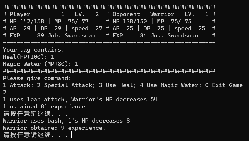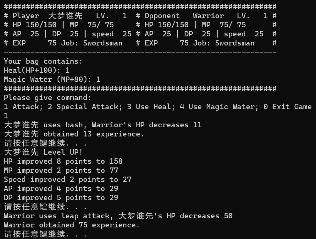 1 //======================= 2 // main.cpp 3 //======================= 4 5 // main function for the RPG style game 6 7 #include <iostream> 8 #include <string> 9 using namespace std; 10 11 #include "swordsman.h" 12 13 int main() 14 { 15 string tempName; 16 bool success = 0; // flag for storing whether operation is successful 17 cout << "Please input player's name: "; 18 cin >> tempName; // get player's name from keyboard input 19 player *human; // use pointer of base class, convenience for polymorphism 20 int tempJob; // temp choice for job selection 21 do 22 { 23 cout << "Please choose a job: 1 Swordsman, 2 Archer, 3 Mage" << endl; 24 cin >> tempJob; 25 system("cls"); // clear the screen 26 switch (tempJob) 27 { 28 case 1: 29 human = new swordsman(1, tempName); // create the character with user inputted name and job 30 success = 1; // operation succeed 31 break; 32 default: 33 break; // In this case, success=0, character creation failed 34 } 35 } while (success != 1); // so the loop will ask user to re-create a character 36 37 int tempCom; // temp command inputted by user 38 int nOpp = 0; // the Nth opponent 39 for (int i = 1; nOpp < 5; i += 2) // i is opponent's level 40 { 41 nOpp++; 42 system("cls"); 43 cout << "STAGE" << nOpp << endl; 44 cout << "Your opponent, a Level " << i << " Swordsman." << endl; 45 system("pause"); 46 swordsman enemy(i, "Warrior"); // Initialise an opponent, level i, name "Junior" 47 human->reFill(); // get HP/MP refill before start fight 48 49 while (!human->death() && !enemy.death()) // no died 50 { 51 success = 0; 52 while (success != 1) 53 { 54 showinfo(*human, enemy); // show fighter's information 55 cout << "Please give command: " << endl; 56 cout << "1 Attack; 2 Special Attack; 3 Use Heal; 4 Use Magic Water; 0 Exit Game" << endl; 57 cin >> tempCom; 58 switch (tempCom) 59 { 60 case 0: 61 cout << "Are you sure to exit? Y/N" << endl; 62 char temp; 63 cin >> temp; 64 if (temp == 'Y' || temp == 'y') 65 return 0; 66 else 67 break; 68 case 1: 69 success = human->attack(enemy); 70 human->isLevelUp(); 71 enemy.isDead(); 72 break; 73 case 2: 74 success = human->specialatt(enemy); 75 human->isLevelUp(); 76 enemy.isDead(); 77 break; 78 case 3: 79 success = human->useHeal(); 80 break; 81 case 4: 82 success = human->useMW(); 83 break; 84 default: 85 break; 86 } 87 } 88 if (!enemy.death()) // If AI still alive 89 enemy.AI(*human); 90 else // AI died 91 { 92 cout << "YOU WIN" << endl; 93 human->transfer(enemy); // player got all AI's items 94 } 95 if (human->death()) 96 { 97 system("cls"); 98 cout << endl 99 << setw(50) << "GAME OVER" << endl; 100 human->death();//6_ ? ? ? ? ? ? ? ? ? ? ? // player is dead, program is getting to its end, what should we do here? 101 system("pause"); 102 return 0; 103 } 104 } 105 } 106 human->isLevelUp();//7_ ? ? ? ? ? ? ? ? ? // You win, program is getting to its end, what should we do here? 107 system("cls"); 108 cout << "Congratulations! You defeated all opponents!!" << endl; 109 system("pause"); 110 return 0; 111 }