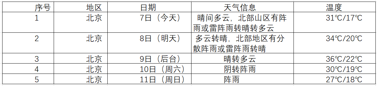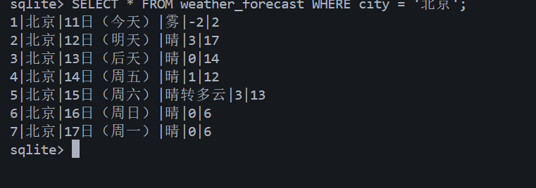 date_tag = day.select_one("h1") or day.select_one("div.date") if not date_tag: continue date = date_tag.text.strip() weather_tag = day.select_one("p.wea") if not weather_tag: continue weather = weather_tag.text.strip() # 提取温度(兼容格式,避免索引越界) temp = day.select_one("p.tem").text.strip() temp_parts = temp.replace("℃", "").split("/") # 处理温度拆分异常 if len(temp_parts) >= 2: temp_max = int(temp_parts[0].strip()) if temp_parts[0].strip().isdigit() else 0 temp_min = int(temp_parts[1].strip()) if temp_parts[1].strip().isdigit() else 0 else: temp_val = int(temp_parts[0].strip()) if temp_parts[0].strip().isdigit() else 0 temp_max = temp_val temp_min = temp_val - 4 weather_data.append({ "city": city_name, "date": date, "weather": weather, "temp_min": temp_min, "temp_max": temp_max })