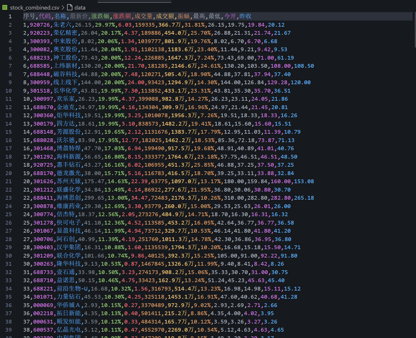 stock_list = [] # 解析API返回的字段(通过分析response确定f12=代码、f14=名称等映射关系) for item in data["data"]["diff"]: stock_list.append({ "code": item["f12"], # 股票代码 "name": item["f14"], # 股票名称 "price": item["f2"] / 100, # 最新价(API返回值需除以100还原真实值) "change_rate": item["f3"] / 100 # 涨跌幅(百分比,同样需除以100) }) return stock_list |