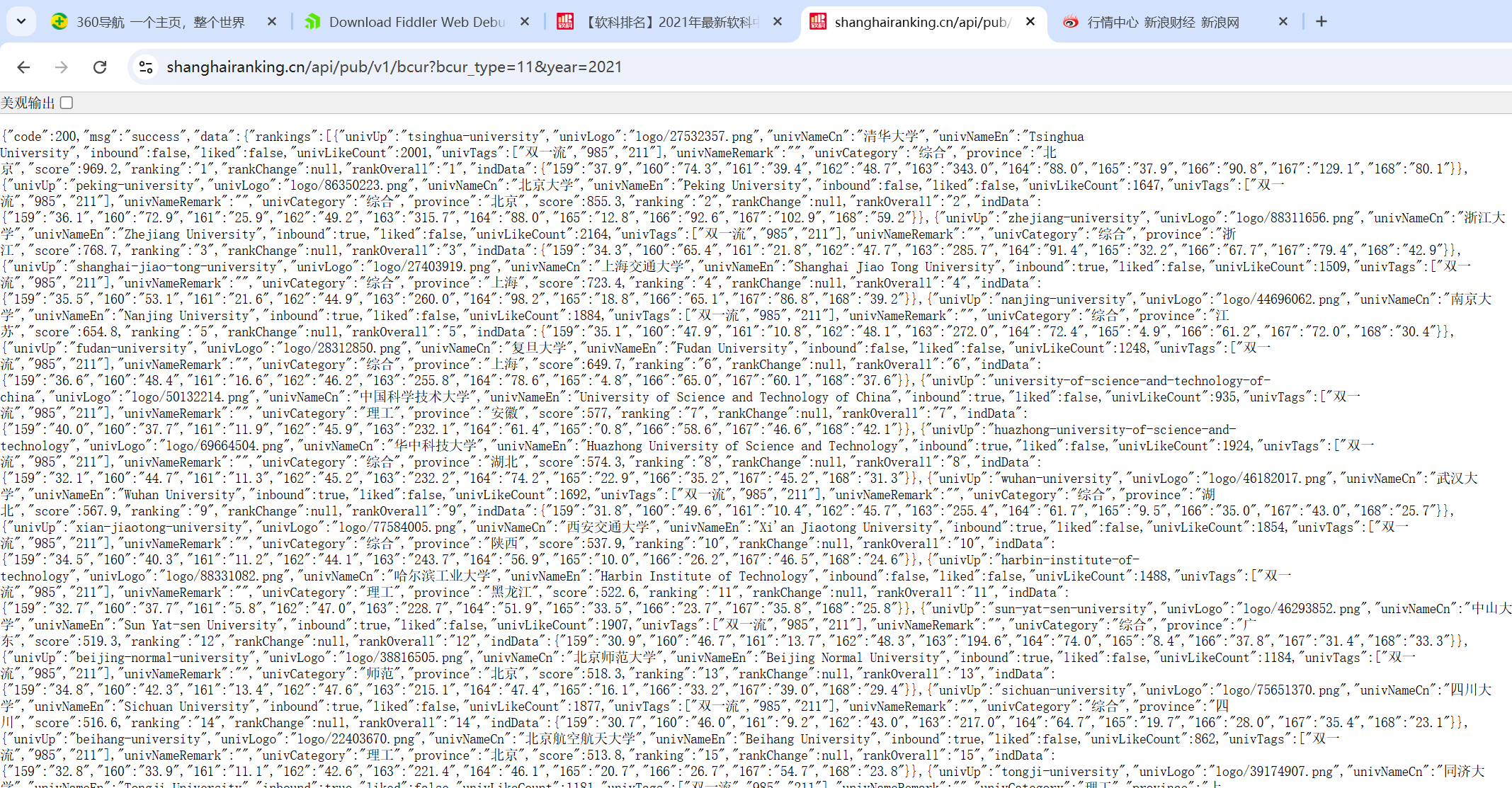 - API定位:在上海软科排名页面,通过F12的XHR过滤器,找到加载排名数据的API(/api/pub/v1/bcur),其参数year=2021指定了年份。