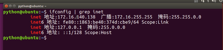 1、在ubutu终端中,输入ifconfig查询ubutu机器的ip地址
