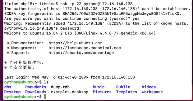 恶作剧:我们在使用ssh的时候可以指定远程地址,如果我们把远程地址改成同桌的ip地址,他恰好没有修改ubutu机器python用户的密码,那么当我们在mac终端输入shutdown -r now 将会使得同桌的ubutu系统再不知情的情况下重启系统。