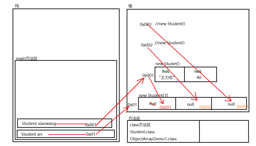 赋值之前new Student里面是两个null,赋值之后是("王力宏", 40),假设这里的地址值是0x001