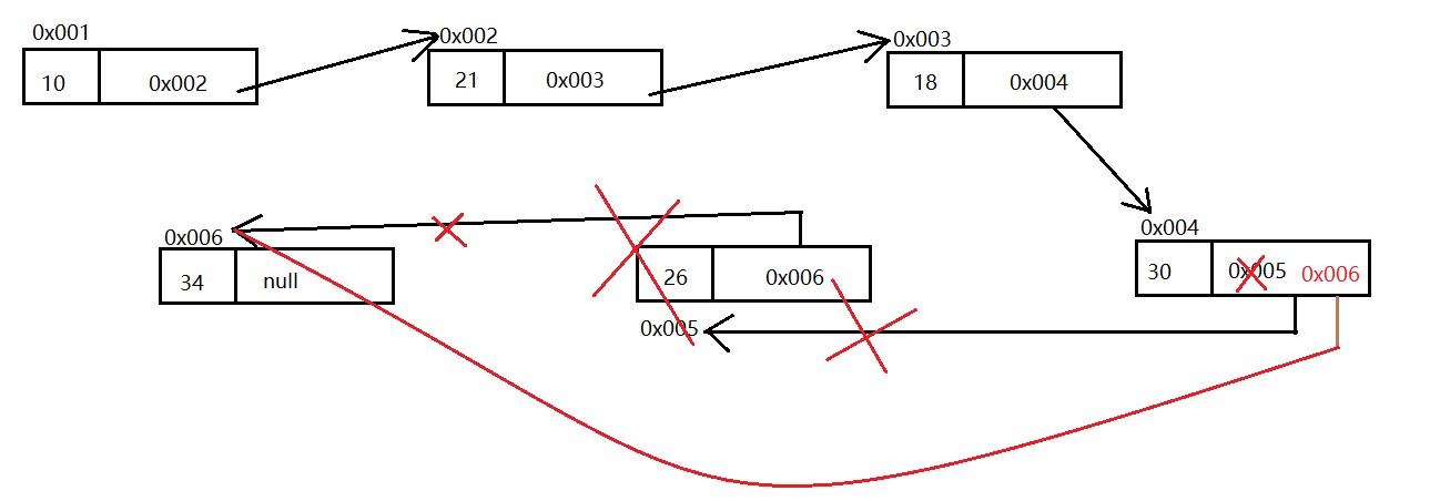 链表删除元素时的操作:以26为例,直接把34的地址值赋值给30的指针域
