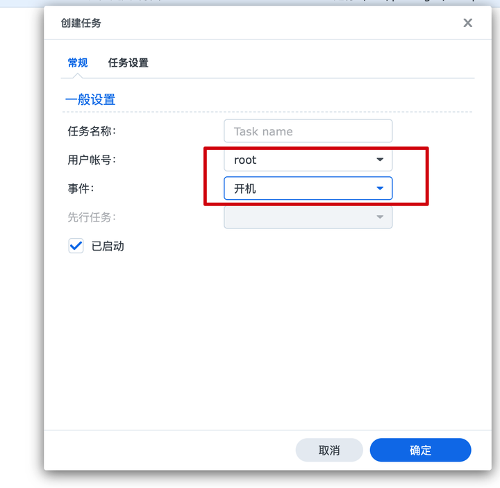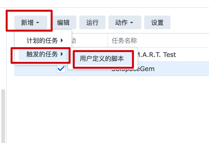 4.1因群辉DSM7以后创建虚拟网卡需要sudo权限执行命令,所以DSM7 以上版本需要额外执行以下操作。确认已经完成安装后,打开桌面的“控制面板”->“任务计划”,点击新增->触发的任务->用户定义的脚本