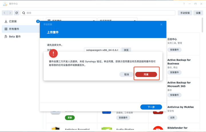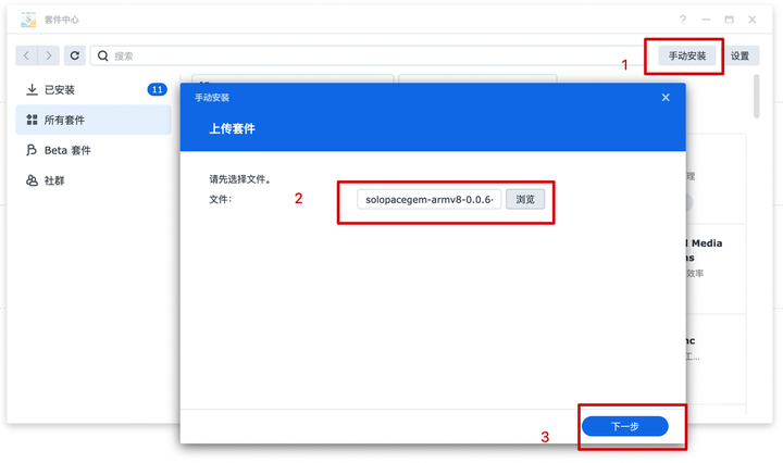 3.2选择“手动安装”->“浏览”,选择下载的对应安装包,点击“下一步”,提示套件为第三方开发者开发请选择“同意”。等待安装完成。