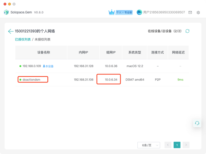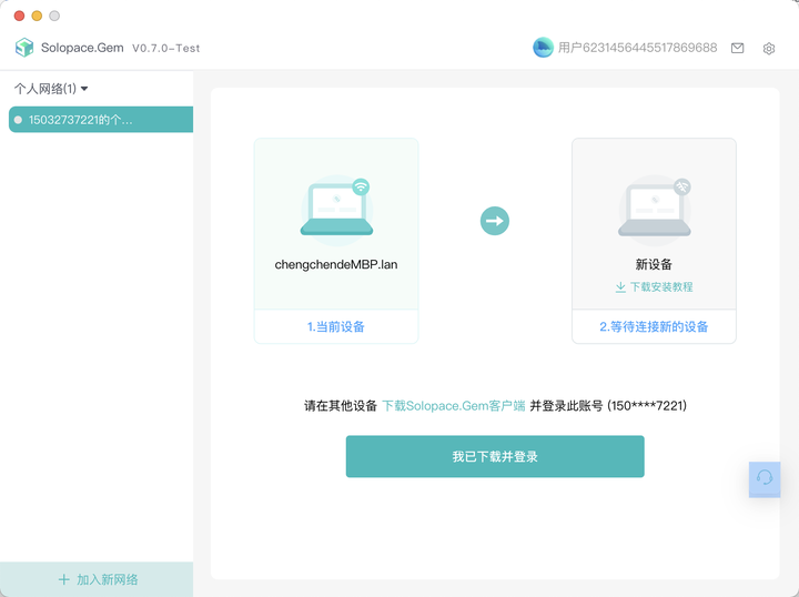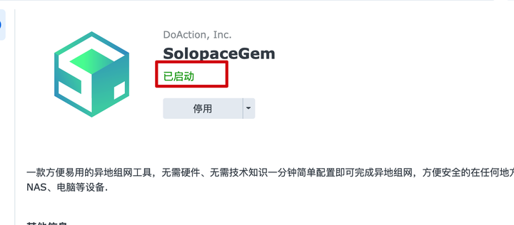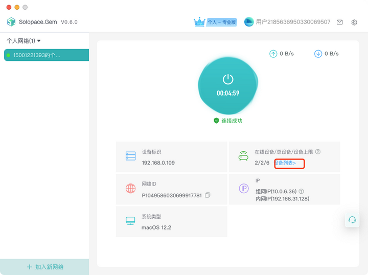 4.进入此页面后,代表当前设备已加入此网络,Solopace.Gem类似一个局域网工具,把你想要互相访问的设备加入到同一个网络下就自动组网成功,所以我们下一步就需要把NAS也加到这个网络中。