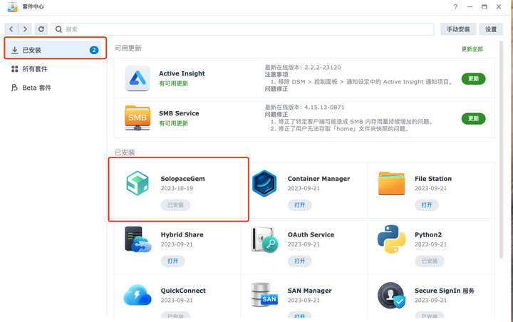 3.3 安装完成后,可在已安装的套件中查看Solopace.Gem状态为已安装。