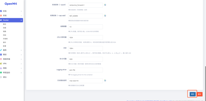 8、命令添加完毕后,系统提根据命令自动填充创建Docker容器的数据,点击提交创建容器。