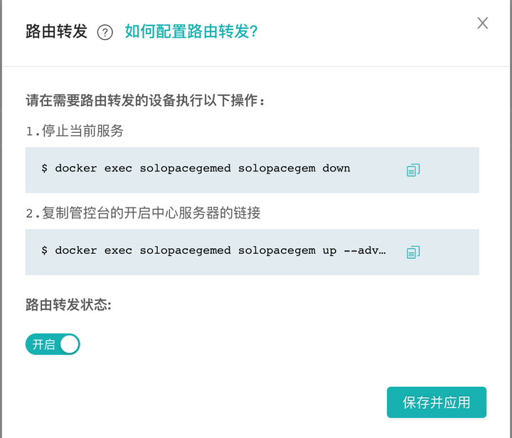 19、分别执行上图中的命令并将路由转发状态按钮改为开启,点击保存并应用,必须先执行命令后再点击后台的保存,否则会报错,保存后会显示已开启路由转发