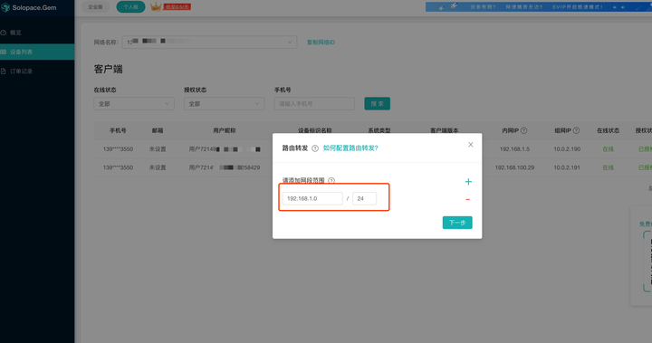 此时在客户端内设备列表复制OpenWrt的组网IP就可以直接外网访问了,但是目前只是PC客户端与OpenWrt连接成功了,但是要想访问OpenWrt下面的其他设备就需要开启路由转发了,此软件默认免费两台设备,开启路由转发之后就可以脱离这个限制。