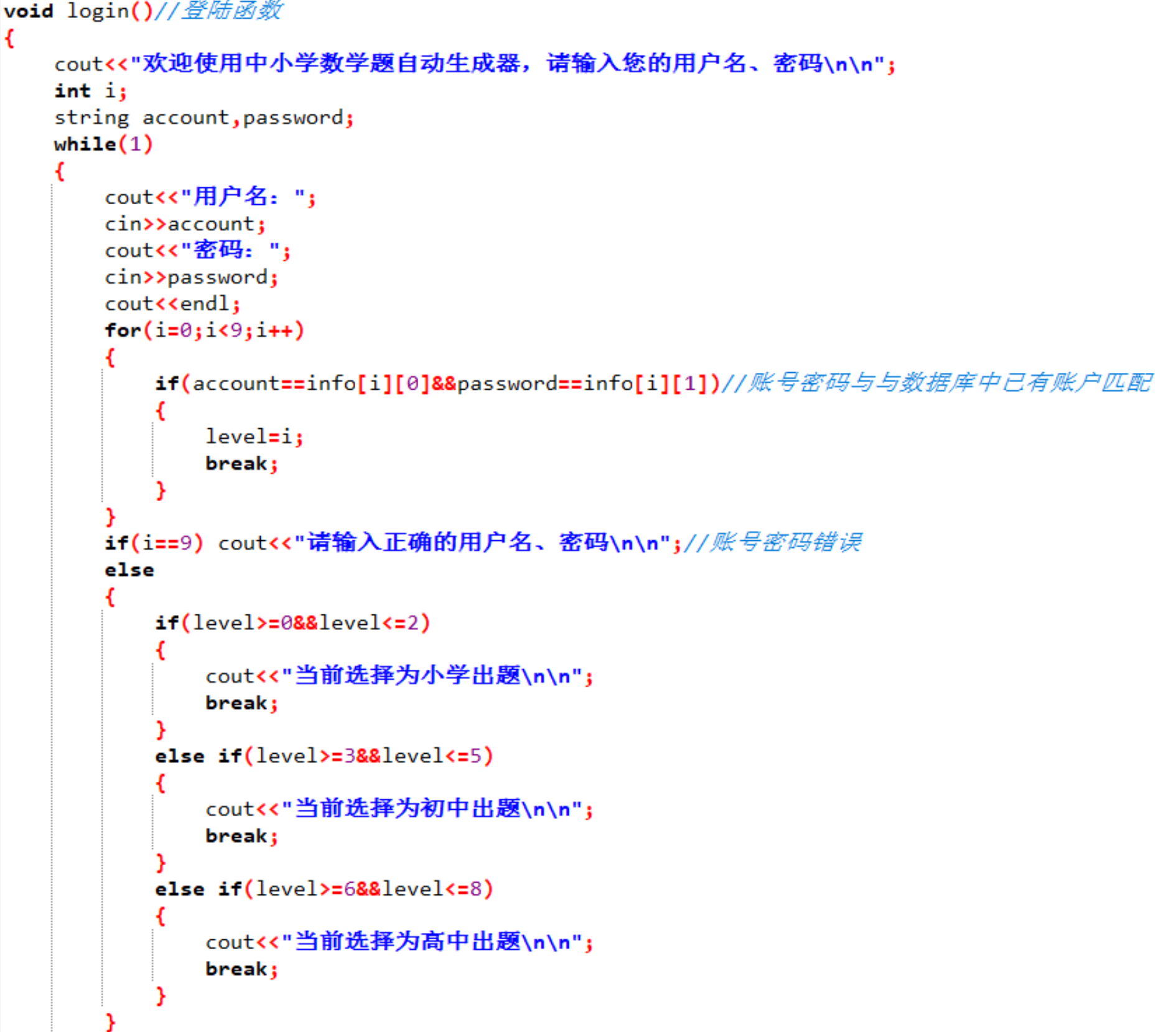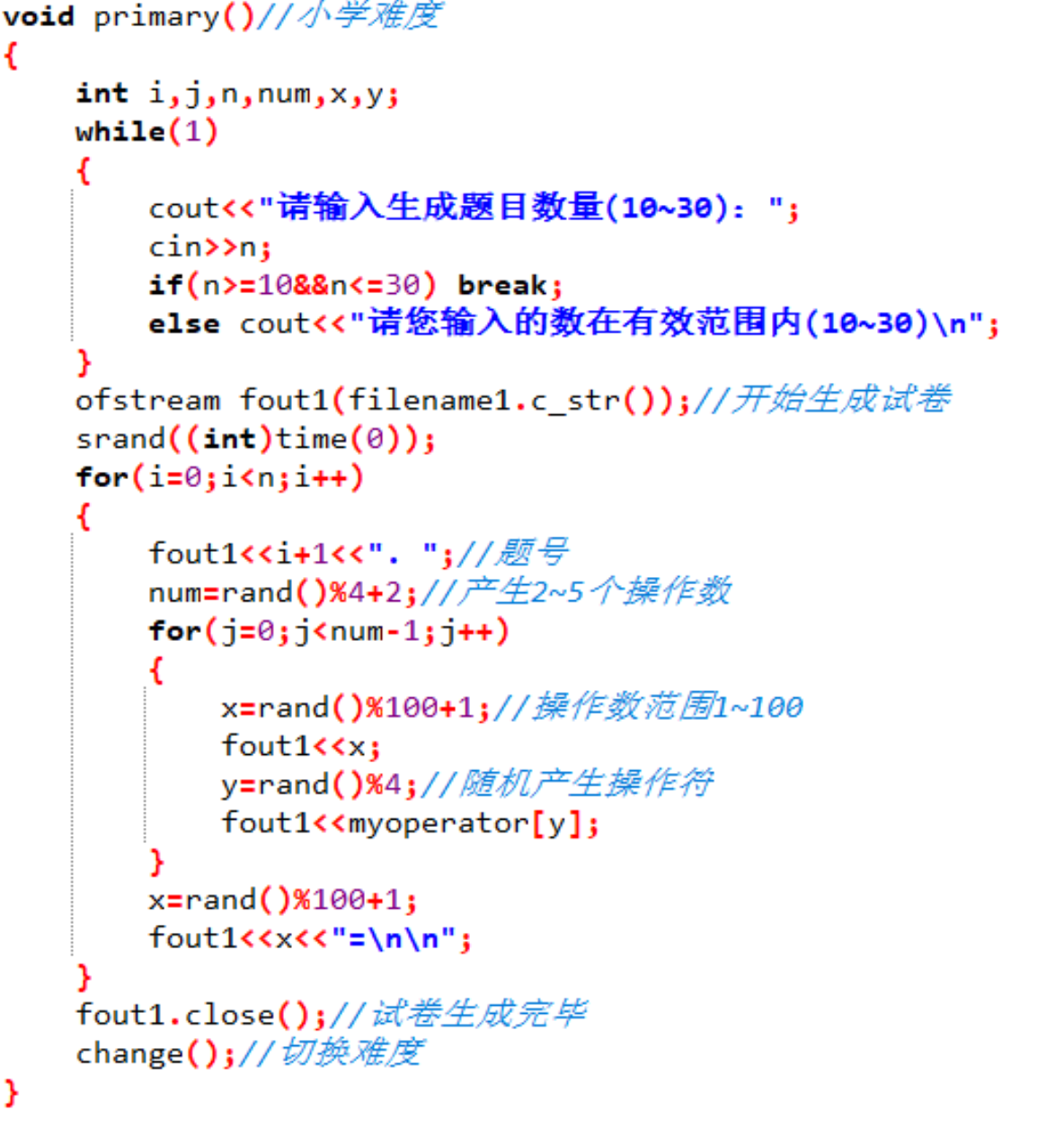代码是C++语言编写,分为四部分:三个级别的题目生成和输出,以及主函数。