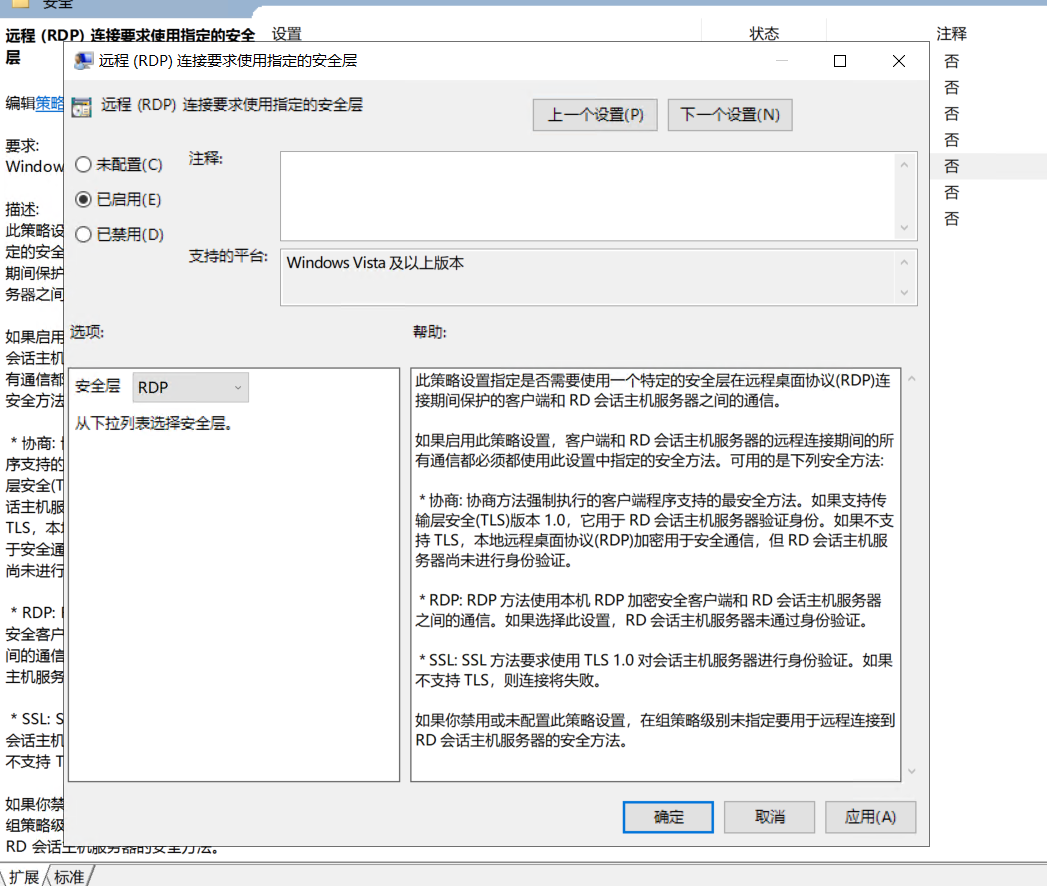 管理模板-Windows组件-远程桌面服务-远程桌面会话主机-安全-远程(RDP)连接要求使用指定的安全层,将“安全层”配置为“RDP”