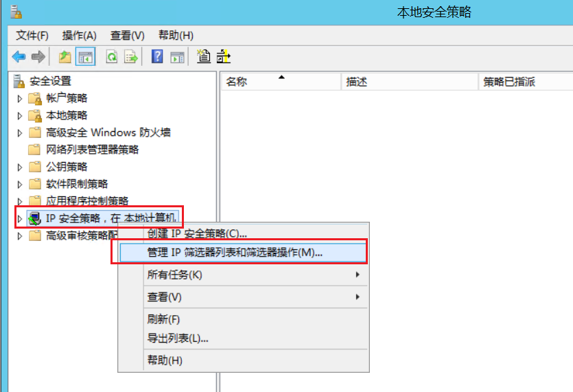 - 右击 “IP安全策略,在本地机器 ” ==>> 选择 “管理IP筛选列表和筛选器操作”