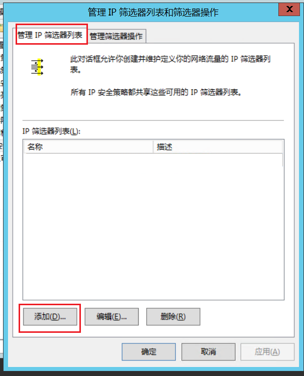 - 在“管理IP筛选列表……”窗口点击“添加”