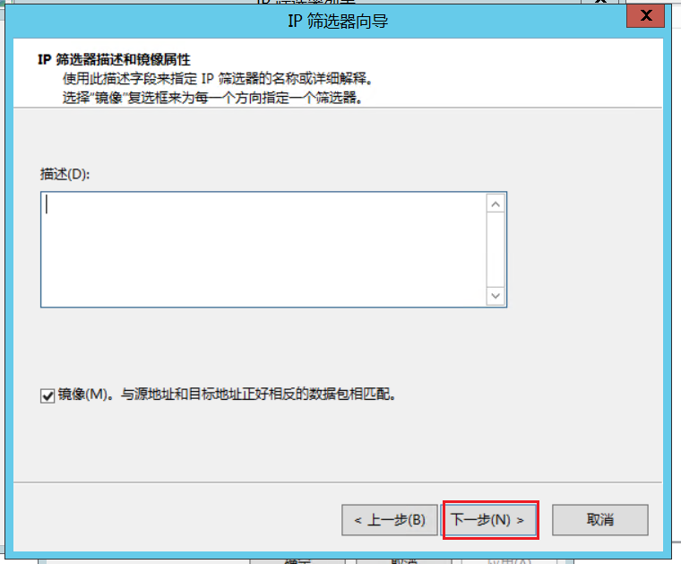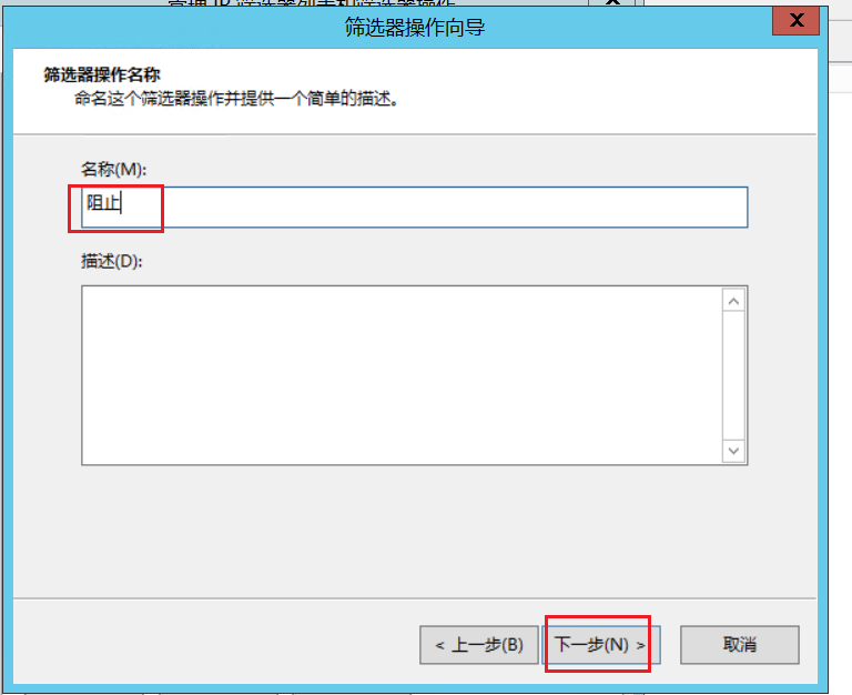 4.弹出ip筛选器向导,点击下一步,输入描述(按照需要填写),点击下一步