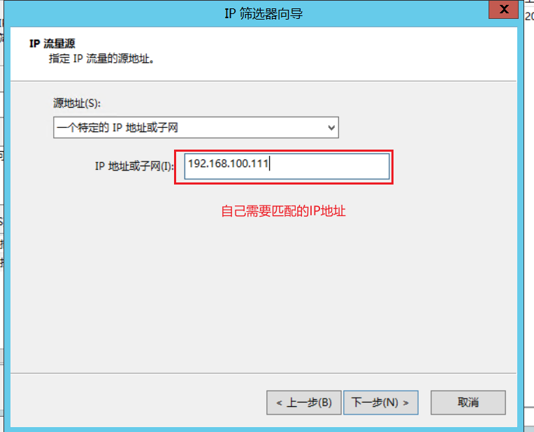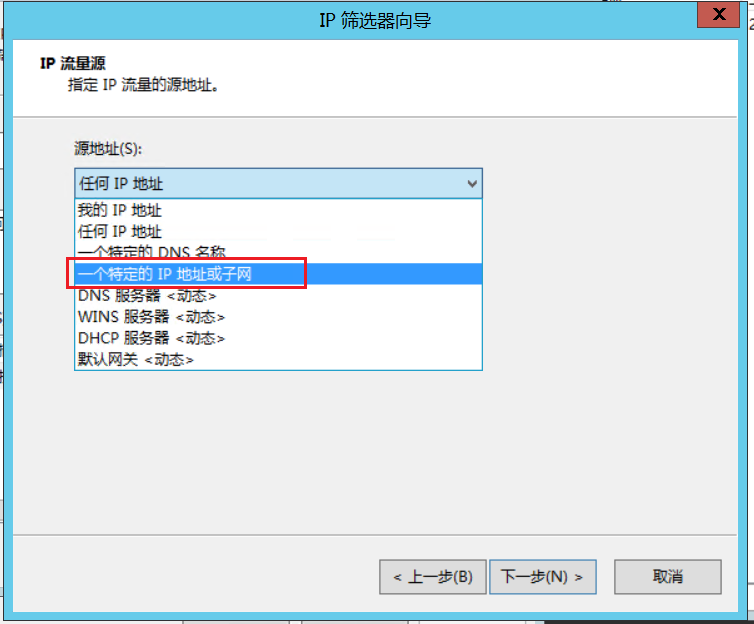 5.点击源地址下拉按钮选择“一个特定的IP地址或子网”,将需要阻止的IP填入后门空白框中,点击下一步