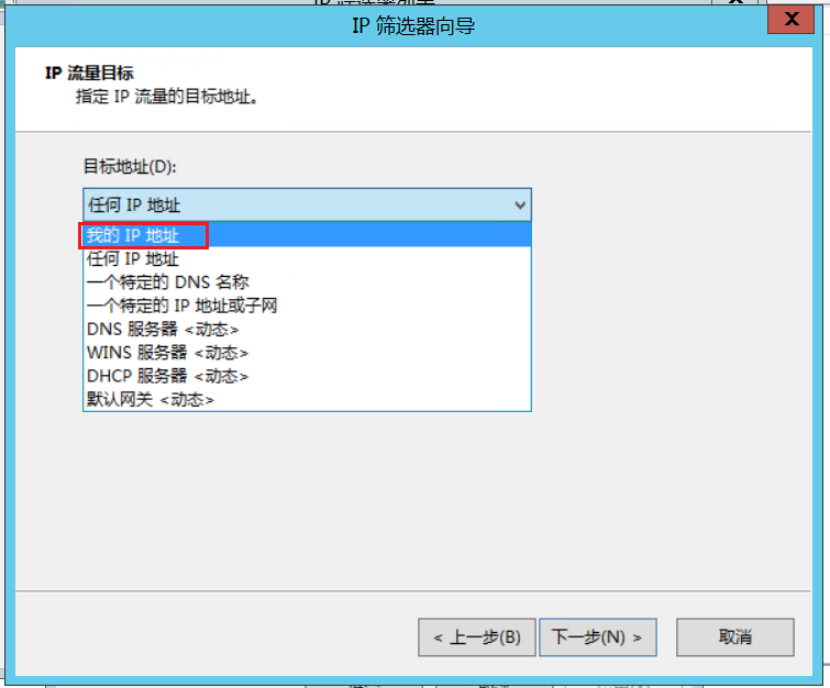 6.点击目标地址的下拉按钮选择“我的ip地址”,点击下一步