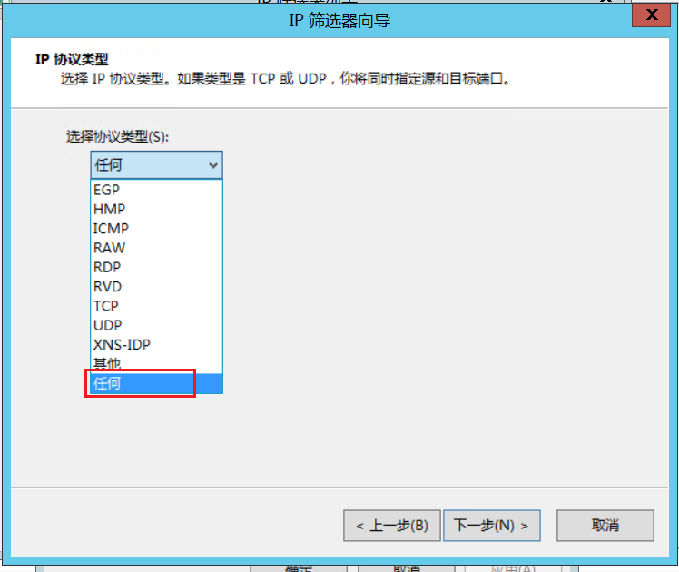 7.由于是要阻止恶意ip,所以协议类型默认选择“任何”,点击下一步