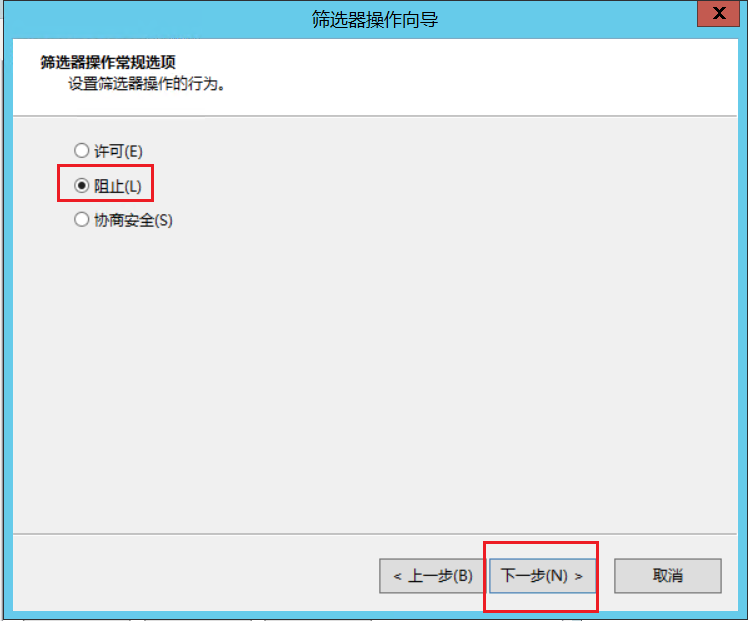 3.筛选器操作常规选项:选择“阻止”,点击下一步,然后点击完成