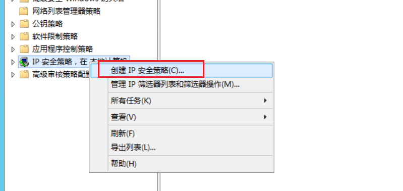 1.右击“IP安全策略,在本地机器 ”---“创建ip安全策略”