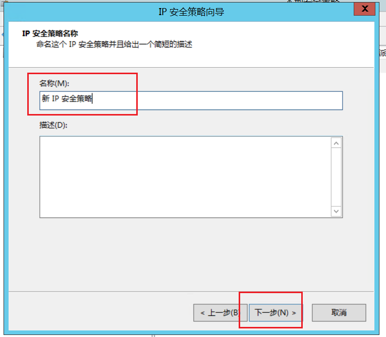 3.设定ip安全策略名称和描述,根据个人需要填写下,点击下一步,直至点击完成