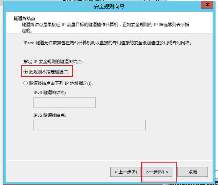 6.在隧道终结点窗口,默认选择“此规则不指定隧道”,点击下一步
