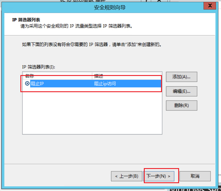 8.ip筛选器列表,选择之前创建的“阻止ip”,点击下一步