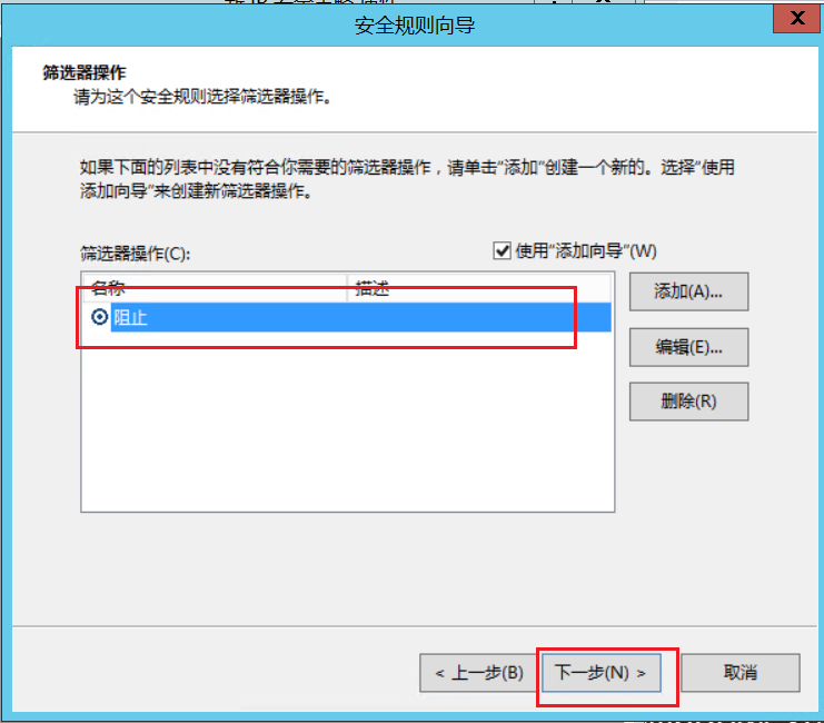 2.管理筛选器操作,在这里设置拦截的动作,是允许通过,还是阻止。