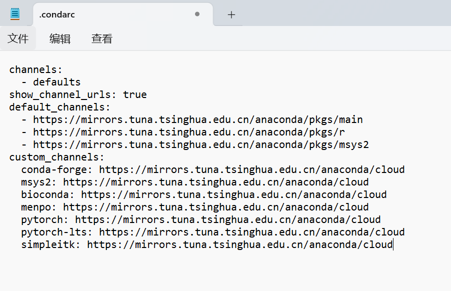 在用户目录中生成一个 Windows 用户无法直接创建名为 .condarc 的文件,可先执行 conda config --set show_channel_urls yes 生成该文件之后再修改(将以下内容拷贝替换到.condarc中即可):