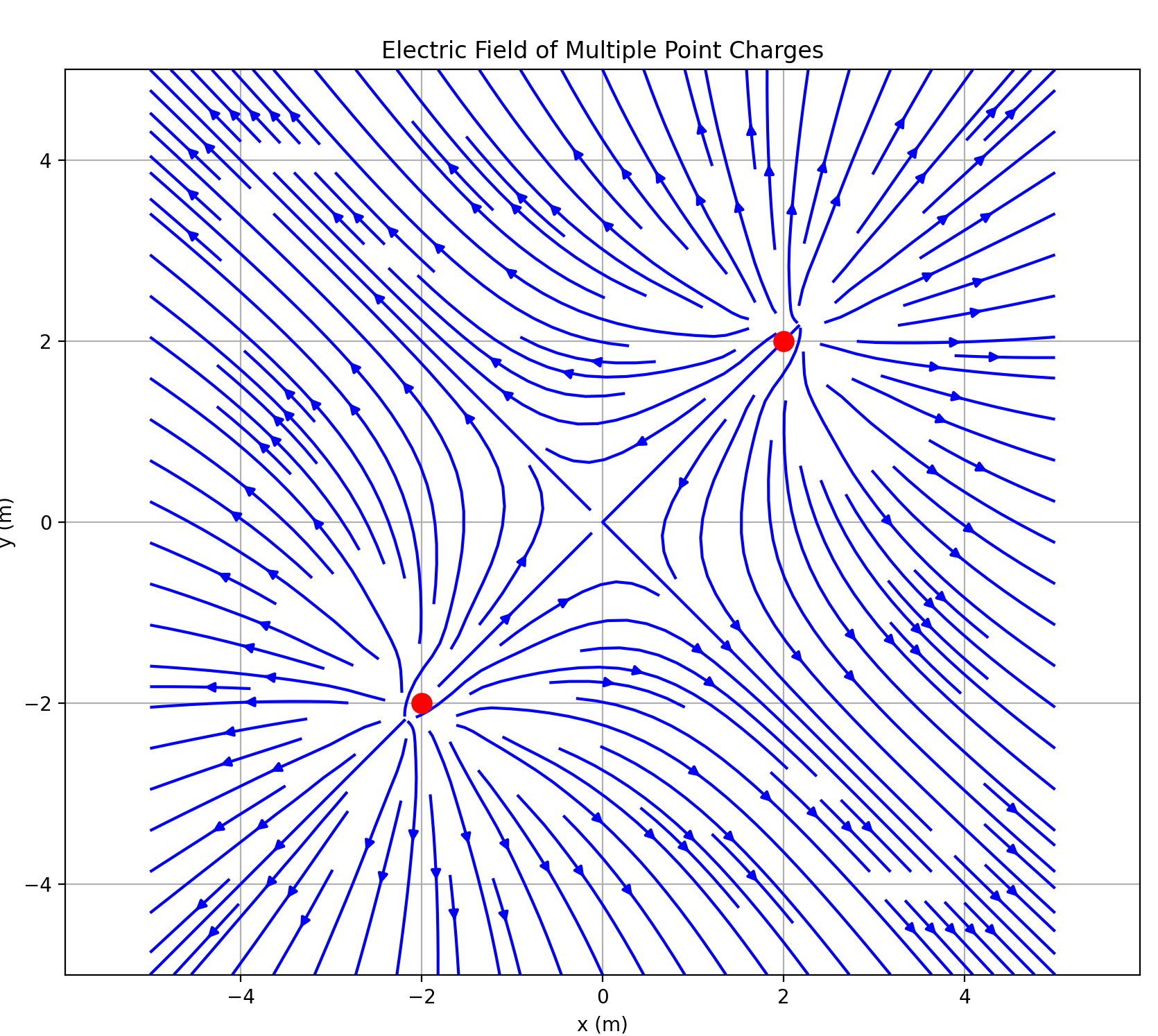 import numpy as np import matplotlib.pyplot as plt # 定义常量 k = 8.99e9 # 库仑常数 (N m^2/C^2) # 定义电荷类 class PointCharge: def __init__(self, charge, position): self.charge = charge self.position = np.array(position) def electric_field(self, X, Y): # 计算电场 r_vector = np.dstack((X, Y)) - self.position r_magnitude = np.linalg.norm(r_vector, axis=2) # 防止除以零 r_magnitude[r_magnitude == 0] = np.inf E_magnitude = k * self.charge / r_magnitude**2 E_direction = r_vector / r_magnitude[:, :, np.newaxis] # 单位矢量 return E_magnitude[:, :, np.newaxis] * E_direction @staticmethod def calculate_electric_field(charges,X, Y): # 初始化电场 E_field = np.zeros((X.shape[0], X.shape[1], 2)) # 计算每个电荷的电场并叠加 for charge in charges: E_field += charge.electric_field(X, Y) # 计算电场的分量 Ex = E_field[:, :, 0] Ey = E_field[:, :, 1] return Ex, Ey @staticmethod def plot_electric_field(X,Y,Ex,Ey): # 绘制电场线 plt.figure(figsize=(10, 10)) # 使用 streamplot 绘制电场线 plt.streamplot(X, Y, Ex, Ey, color='b', linewidth=1.5, density=1.5) # 绘制电荷位置 for charge in charges: plt.plot(charge.position[0], charge.position[1], 'ro' if charge.charge > 0 else 'bo', markersize=10) plt.xlim(-5, 5) plt.ylim(-5, 5) plt.title('Electric Field of Multiple Point Charges') plt.xlabel('x (m)') plt.ylabel('y (m)') plt.grid() plt.axis('equal') plt.show() if __name__ == '__main__': # 创建多个电荷 charges = [ PointCharge(1e-6, (-2, -2)), # 正电荷 # PointCharge(-1e-6, (2, 0)), # 负电荷 PointCharge(1e-6, (2, 2)), # 正电荷 # PointCharge(-1e-6, (0, -2)), # 负电荷 ] # 定义网格 x = np.linspace(-5, 5, 20) y = np.linspace(-5, 5, 20) X, Y = np.meshgrid(x, y) Ex,Ey= PointCharge.calculate_electric_field(charges, X, Y) # 绘制电场线 PointCharge.plot_electric_field(X, Y, Ex, Ey)