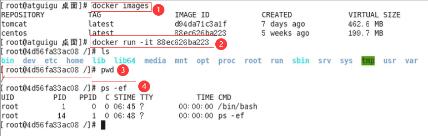 序号3处的[root@4d56fa33ac08]表示现在处于docker中的centos容器中