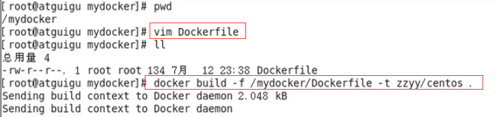 编写完成后保存退出,就在Dockerfile所在目录下执行命令:docker build -f /mydocker/Dockerfile -t zzyy/centos .
